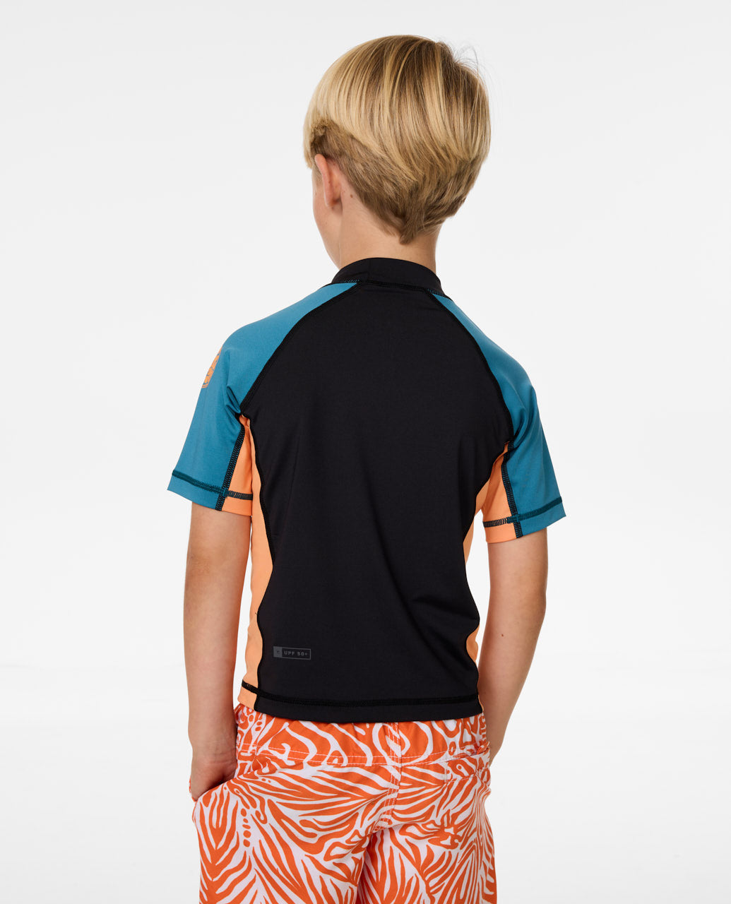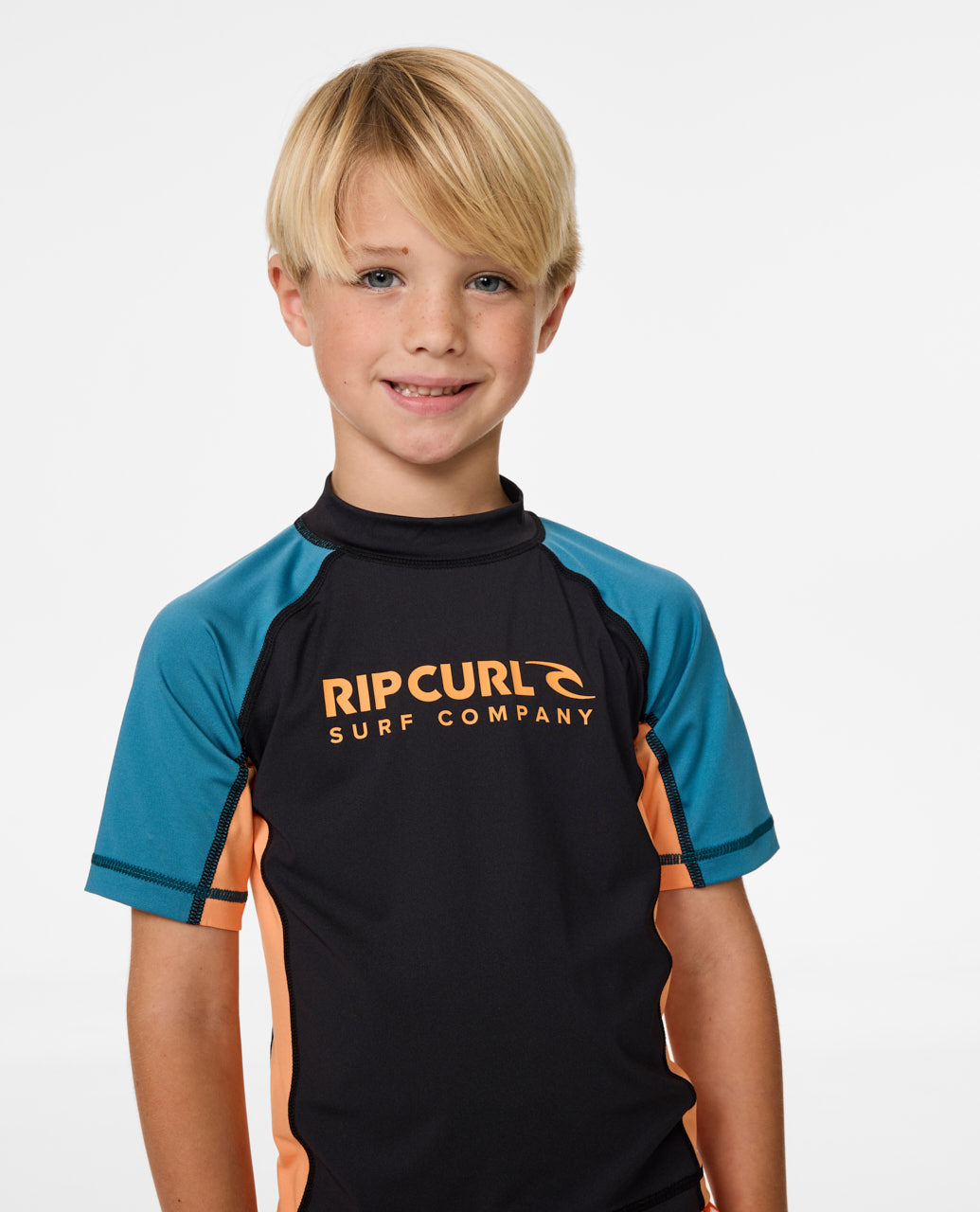 Features: Elastic boardshort loop, UPF 50+UV sun protection rash vest, Heat transfer, Front print, Flatlock stitch detail, Chlorine friendly.