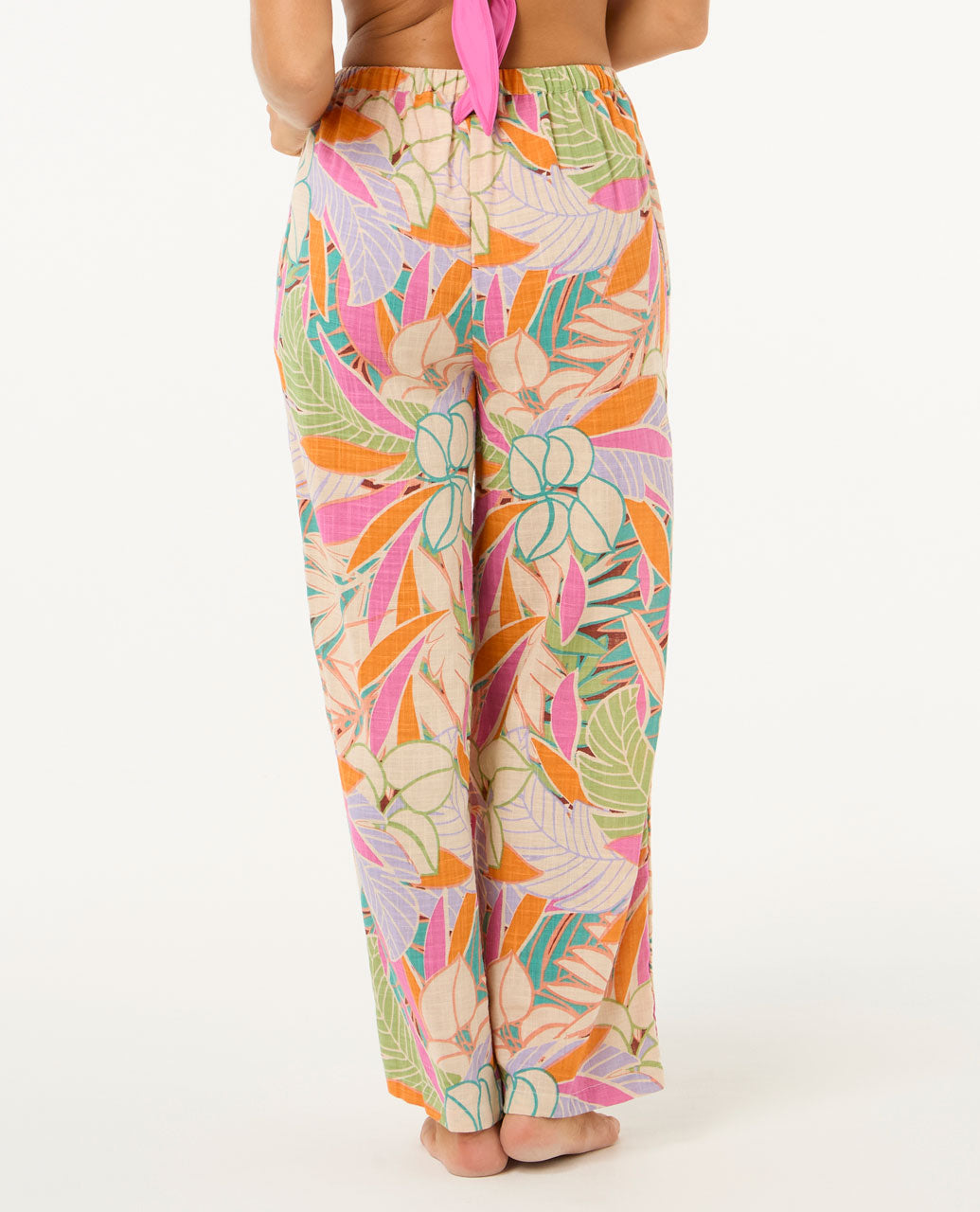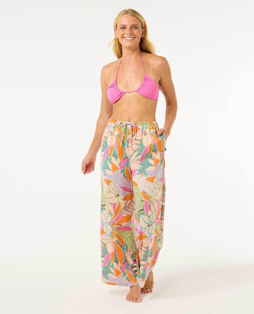 Features: Metal logo trim, Placement print, All over yardage print, Elastic waistband, Functional front tie.